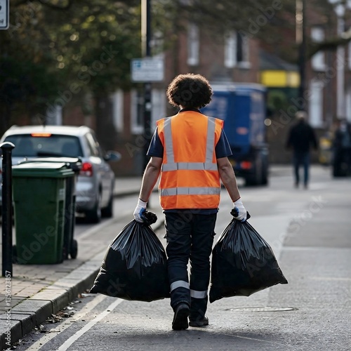 © Jittiwan, Obraz premium a sanitation worker or garage collector clad in an orange safety vest and white gloves carrying black trash bags along a bustling city street.