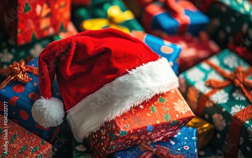 Fototapeta premium A Santa hat resting on a pile of colorful wrapped presents. Professional...