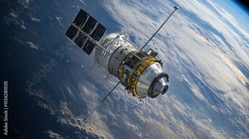 © peerawat, Obraz premium A satellite assembling itself in low Earth orbit