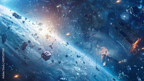 Obraz premium A satellite breaking apart after colliding with space debris, symbolizing the...