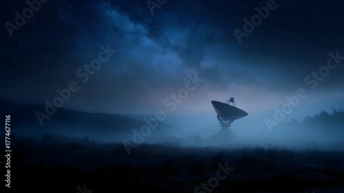 Fototapeta premium A satellite dish stands in a misty rural landscape under a starry night sky
