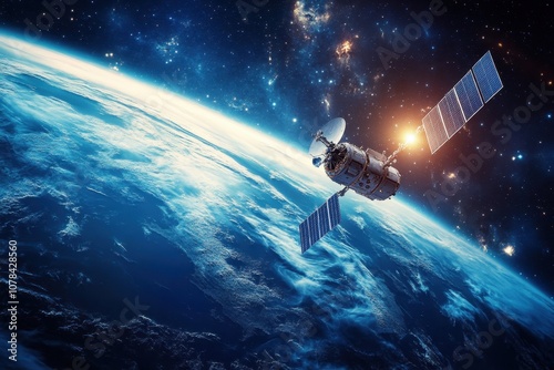 Obraz premium A satellite orbits Earth against the backdrop of the cosmos, showcasing...