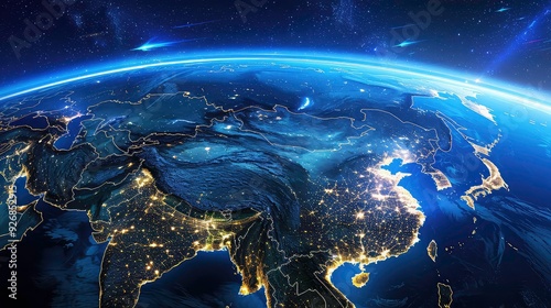 Fototapeta premium A satellite view of Earth at night, showcasing the glowing city lights of Asia, with a backdrop of stars and shooting stars in the dark blue sky.