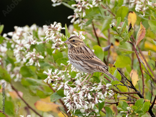 © Christopher, Fototapeta premium A Savannah Sparrow perched in a shrub amongst white flowers