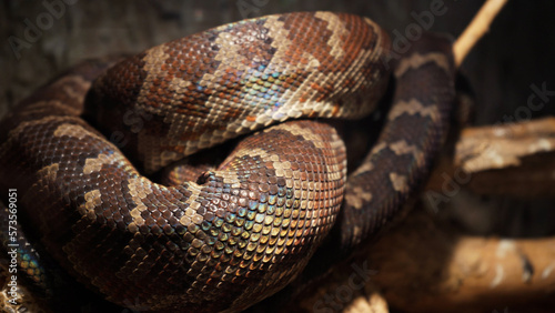 © Yuliia, Obraz premium A scaly large reticulated python coiled up in a knot and waits for a victim. A beautiful pattern on the skin shimmers with a rainbow.