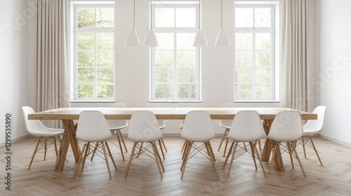 © Pannee, Obraz premium A Scandinavian-style dining room with a wooden table and white chairs.