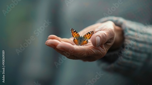 © cloud7days, Fototapeta premium A scarred hand cradles a butterfly, symbolizing hope and resilience.
