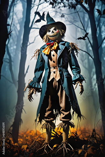 © MHJOARDERMRIDUL, Fototapeta premium A scary scarecrow standing in a dark spooky forest.