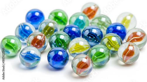 © Toufiqul, Fototapeta premium A scattered collection of colorful glass marbles with swirling patterns on a white background