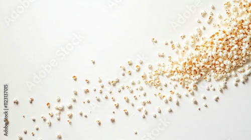 © Arvi, Naklejka premium A scattering of popcorn kernels and popped corn on a white background.