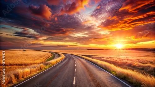 Naklejka premium A scenic asphalt road curves through a golden field under a vibrant sunset...