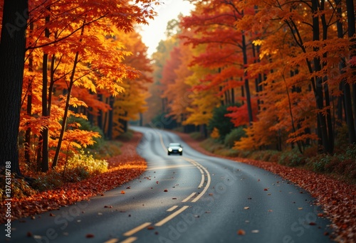 © starush, Obraz premium A scenic autumn road lined with vibrant orange and red trees