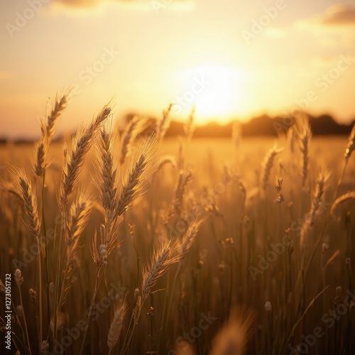 © Pooja, Obraz premium A scenic background featuring a golden wheat field stretching into the horizon, bathed in the soft, warm glow of a setting sun.