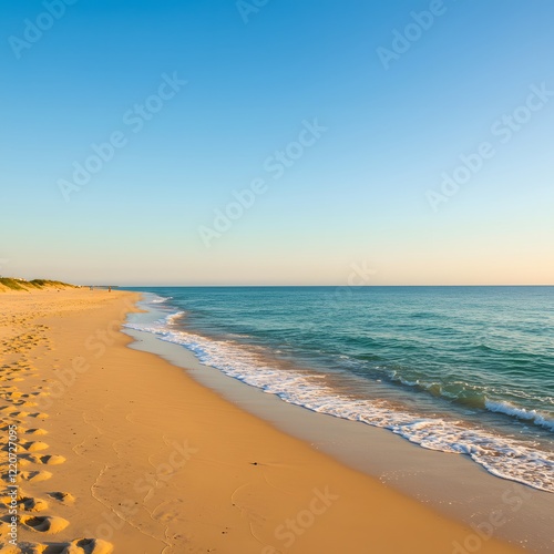 © Josh Zachary, Obraz premium A scenic beach view with a clear sky and a large blank space in the center for text