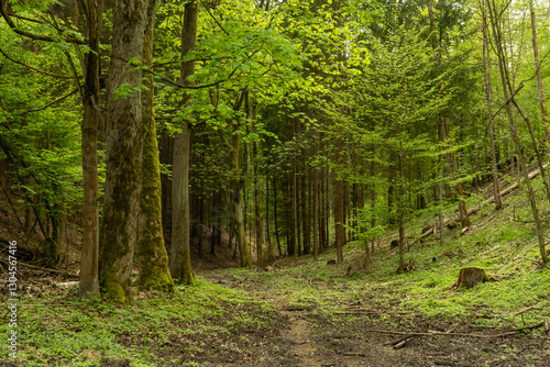 © Dmitry Kovalchuk, Fototapeta premium A scenic dirt road winding its way through a lush green forest