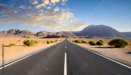 © netsay, Naklejka premium A scenic empty asphalt road stretching into the distance, surrounded by a breathtaking desert landscape under a vibrant sky, perfect for adventure travel and exploration enthusiasts.