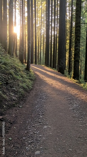 © RafiUllah, Obraz premium A scenic forest trail illuminated by the soft glow of sunlight.