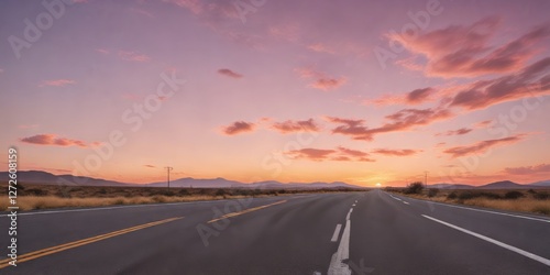 © vattana, Naklejka premium A scenic highway stretches towards a breathtaking sunset, painted in hues of pink and orange across the vast, tranquil landscape