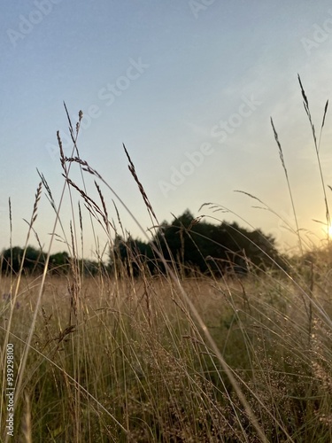 © ssavelyeva1, Fototapeta premium A scenic image capturing tall grass under a clear sky during sunset, with a backdrop of trees and tranquil ambiance, reflecting the beauty of nature and calmness.