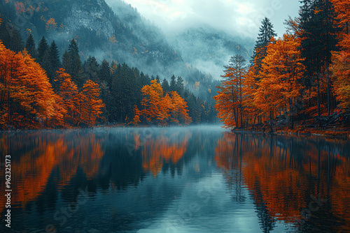 Naklejka premium A scenic lake reflecting the rich autumn colors of the surrounding trees, with a misty morning fog hovering above. Concept of serene autumn scenery.