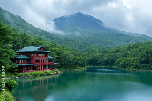 © Batu, Fototapeta premium A scenic lake reflects a building amidst mountainous forested landscape