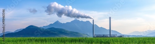 © 1000lnw, Fototapeta premium A scenic landscape featuring a factory with smoke rising against a backdrop of mountains and a green field, highlighting industrial impact.