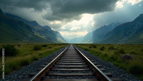 © Wool World, Fototapeta premium A scenic landscape featuring a train track winding through a mountainous landscape under a dramatic sky filled with clouds