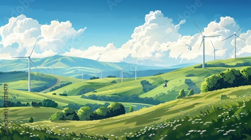 Fototapeta premium A scenic landscape featuring wind turbines on rolling hills, harnessing...