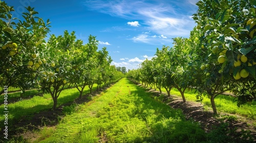 Naklejka premium a scenic lemon orchard landscape with rows of Citrus x limon trees.