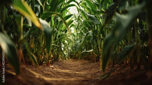 © Aleksandr, Obraz premium A scenic low-angle perspective through rows of green corn plants with visible dry soil path, lit by natural sunlight.