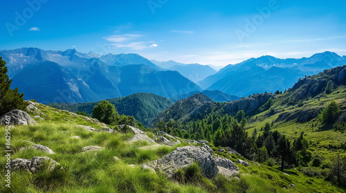 Obraz premium A scenic mountain hike with a clear blue sky, summer, hiking, hd, adventurous...