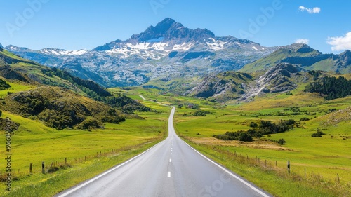 Fototapeta premium A scenic mountain road stretches through lush greenery, leading to majestic peaks under a bright blue sky.
