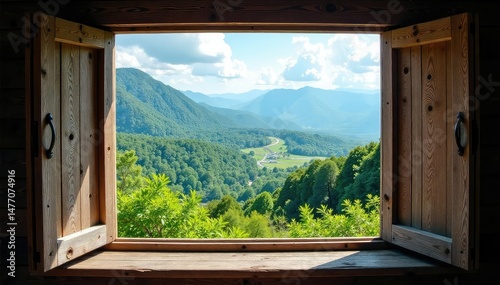© Prasert, Obraz premium A scenic overlook framed by a rustic window Enjoy the breathtaking view , bright, trees