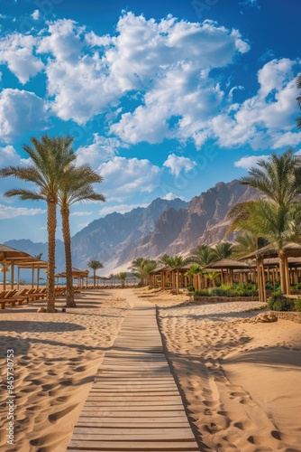 © Fotograf, Obraz premium A scenic path leading to a beach surrounded by palm trees