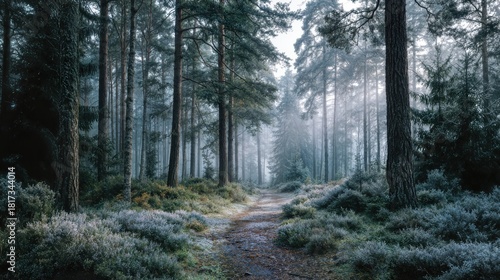 Naklejka premium A scenic path winding through a misty forest. The sun gently filters through...