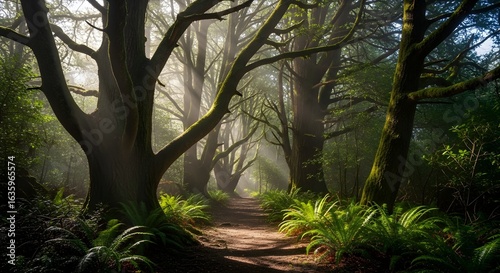 © Rajon Stocks, Fototapeta premium A scenic path winds through a lush forest with sunlight filtering through the trees
