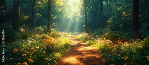 © pngking, Obraz premium A scenic pathway illuminated by sunlight surrounded by vibrant greenery and wildflowers in a tranquil summer forest setting.