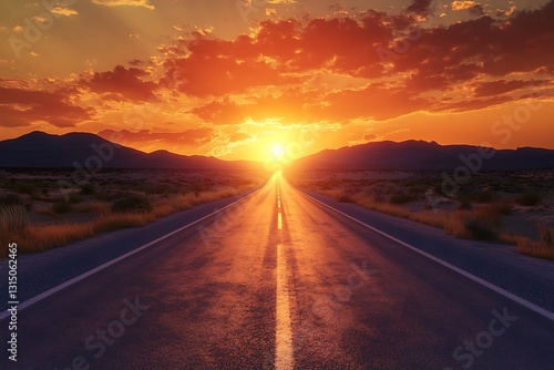 Fototapeta premium A scenic road stretches towards a vibrant sunset over mountains and desert...