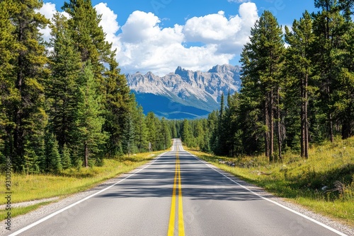 Fototapeta premium A scenic road through a lush forest, leading towards majestic mountains under a bright blue sky with fluffy clouds.
