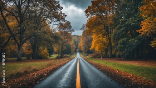 © Sona, Fototapeta premium A scenic road through trees with fall foliage, under a cloudy sky.