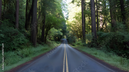 Fototapeta premium A scenic road winds through the majestic Redwood National Forest.
