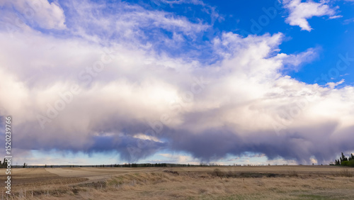 © Saeedatun, Fototapeta premium A scenic rural landscape capturing a freshly seeded agricultural field under a dramatic cloudy spring sky, raining in the horizon.