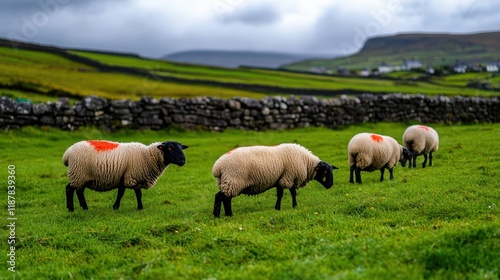 Fototapeta premium A Scenic Rural Landscape with a Group of Sheep Grazing on Green Pastures Under Dramatic Cloudy Skies Near a Stone Wall and Rolling Hills