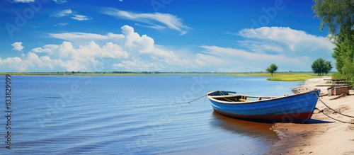 © vxnaghiyev, Naklejka premium A scenic seaside view featuring ships, sandy beaches, the sky, and the picturesque Danube Delta with a backdrop of rolling waves; ideal for copy space image.