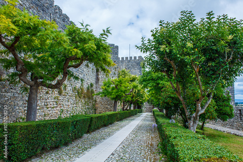 Naklejka premium A scenic stone pathway lined with manicured hedges and lush green trees