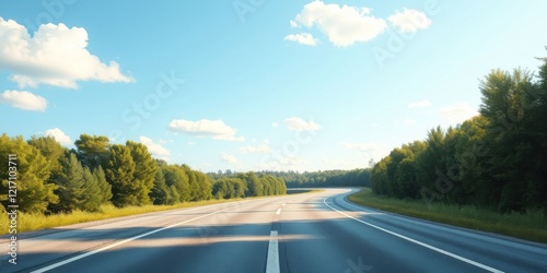 Naklejka premium A scenic summer highway curves gently through a lush green forest under a...