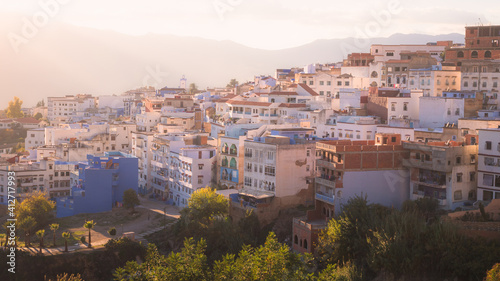 Obraz premium A scenic sunset or sunrise cityscape view over Chefchaouen, Morocco, known as...