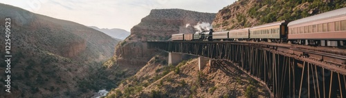 © Pisit, Fototapeta premium A scenic train journey crosses a bridge over a deep canyon.
