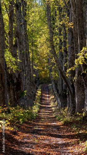 Fototapeta premium A scenic tree-lined path through the forest during autumn colorful...
