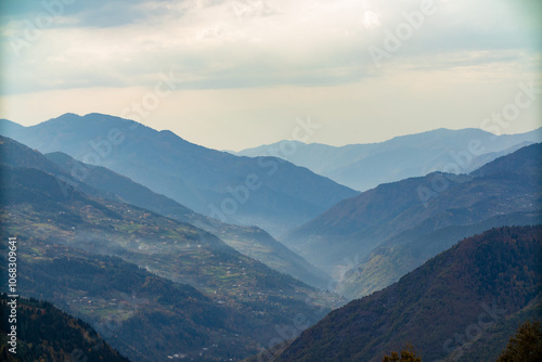 © Yauhen, Naklejka premium A scenic valley surrounded by tall mountains and lush trees